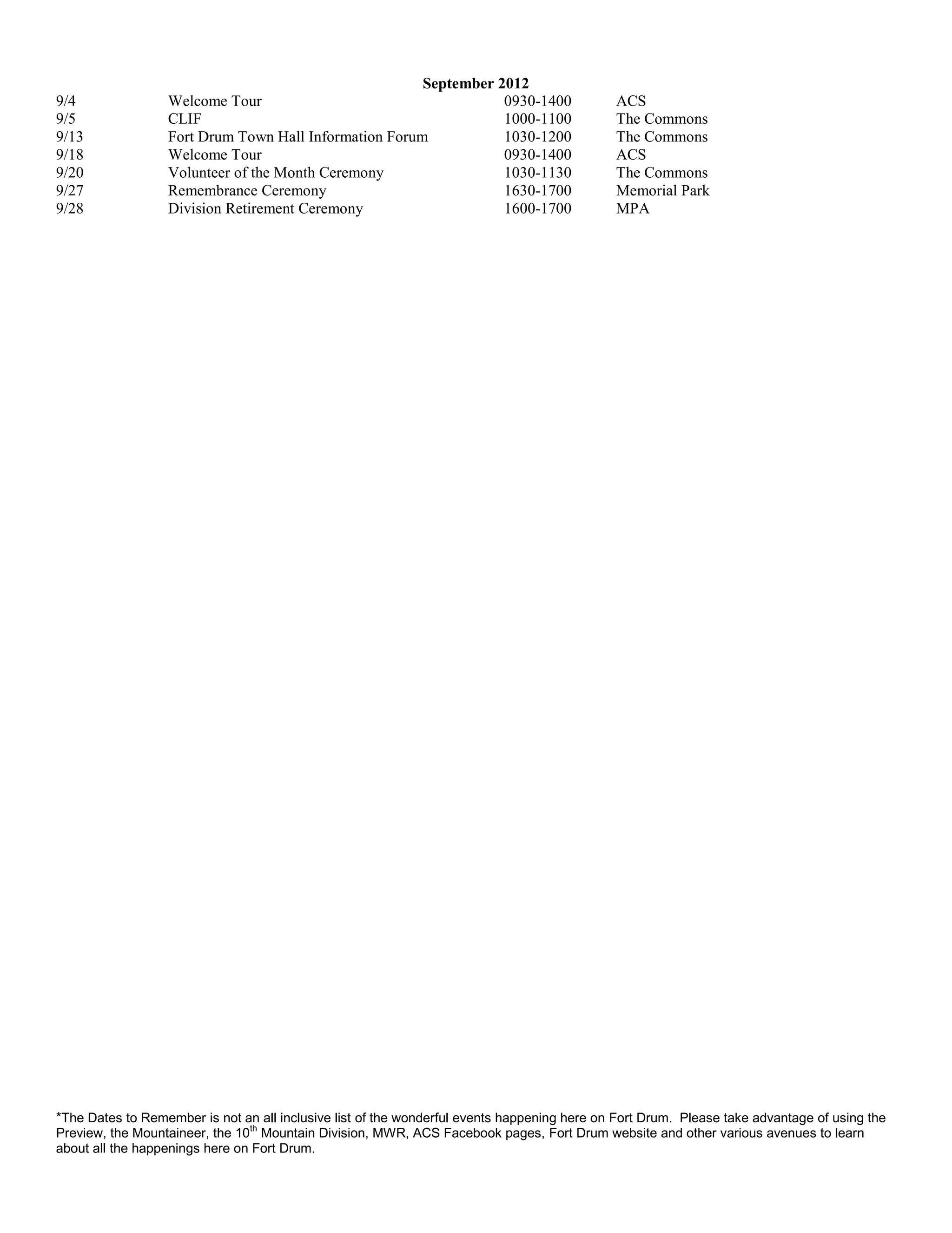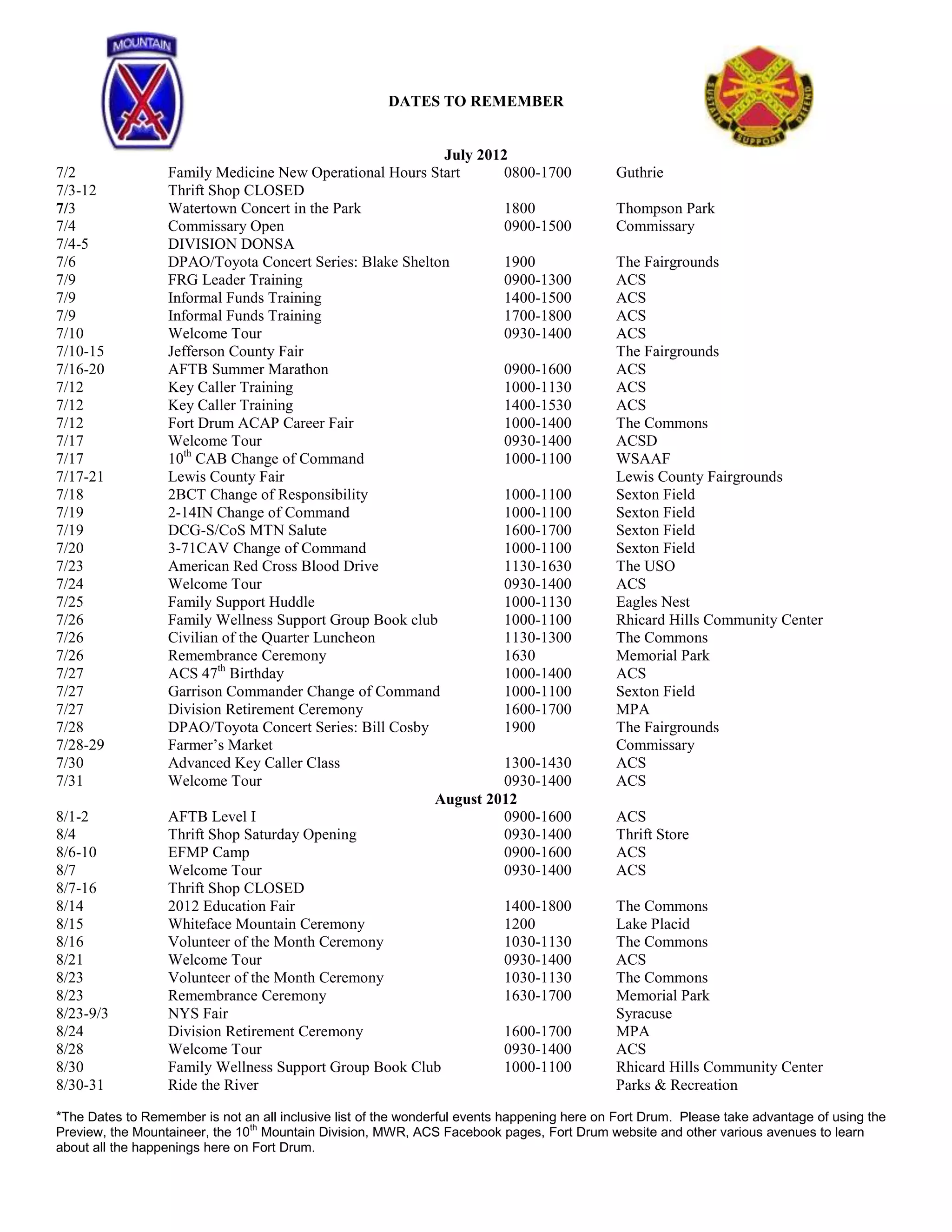 The document lists important dates in July, August, and September 2012 for Fort Drum, including: