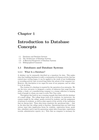 The document provides an overview of database concepts and the entity-relationship (E/R) model. It discusses: