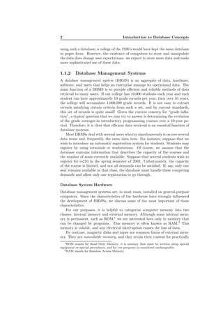 2) The example database for a small college tracks students, instructors, courses, grades, and advising relationships. An E/R diagram shows entities like STUDENTS and relationships like ADVISING.