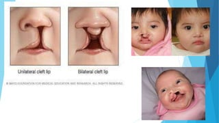 This document discusses cleft lip and cleft palate. It begins by defining cleft lip and cleft palate as congenital anomalies that occur from the failure of tissues in the mouth and lip to fuse properly during embryonic development. The document then covers causes such as genetics and environmental factors. It discusses the pathophysiology of cleft lip and cleft palate in more detail. The rest of the document outlines complications, diagnosis, interventions including feeding techniques and surgical procedures, post-operative care, and monitoring for infection.