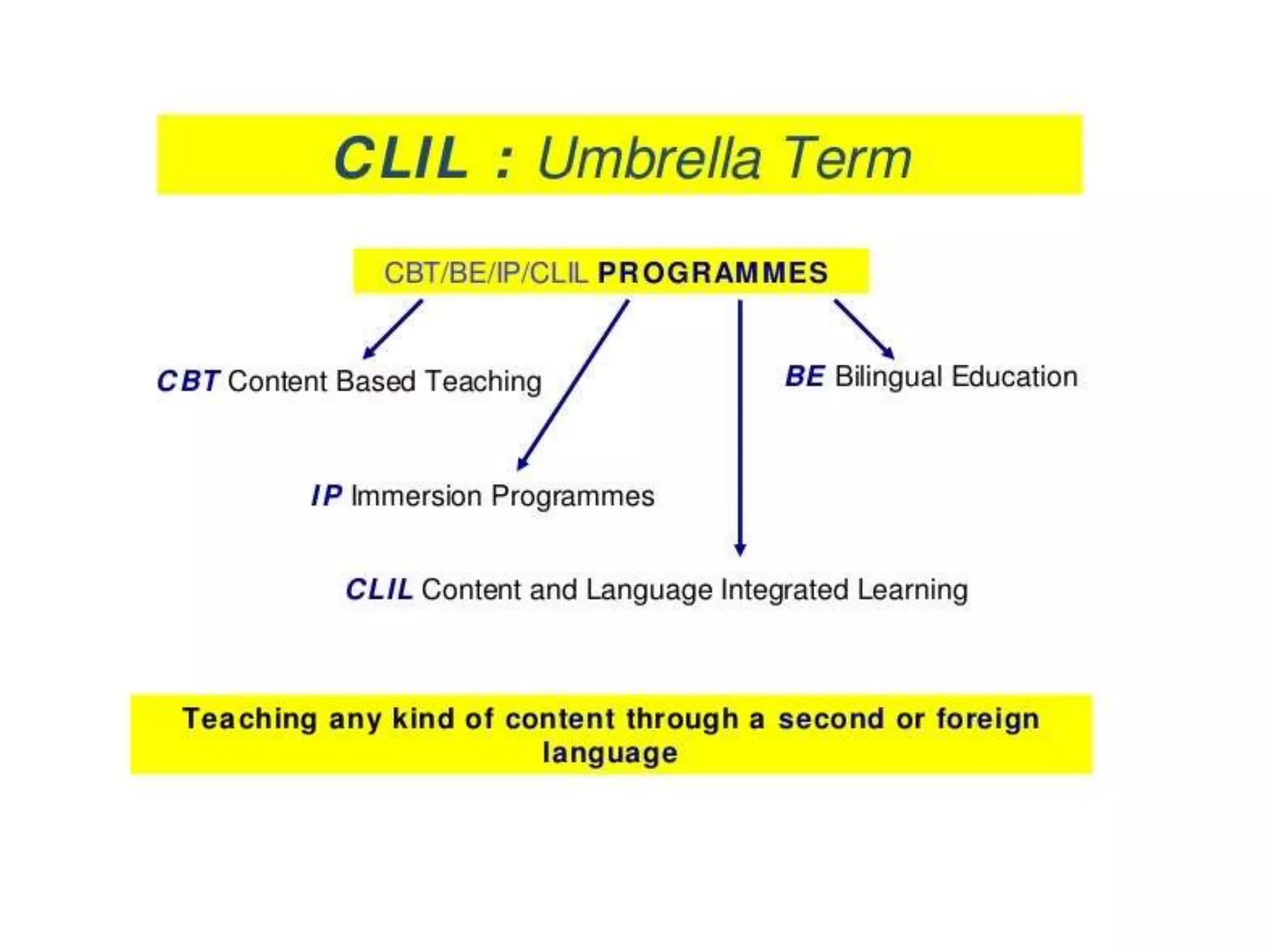 This document provides an overview of CLIL (Content and Language Integrated Learning). CLIL is an approach to teaching subjects such as science or geography through the medium of a foreign language. The document discusses the benefits of CLIL in developing subject knowledge and language ability. It also outlines different types of CLIL implementation and principles for effective CLIL teaching, including the use of scaffolding techniques and a focus on interaction, output, and developing thinking skills.