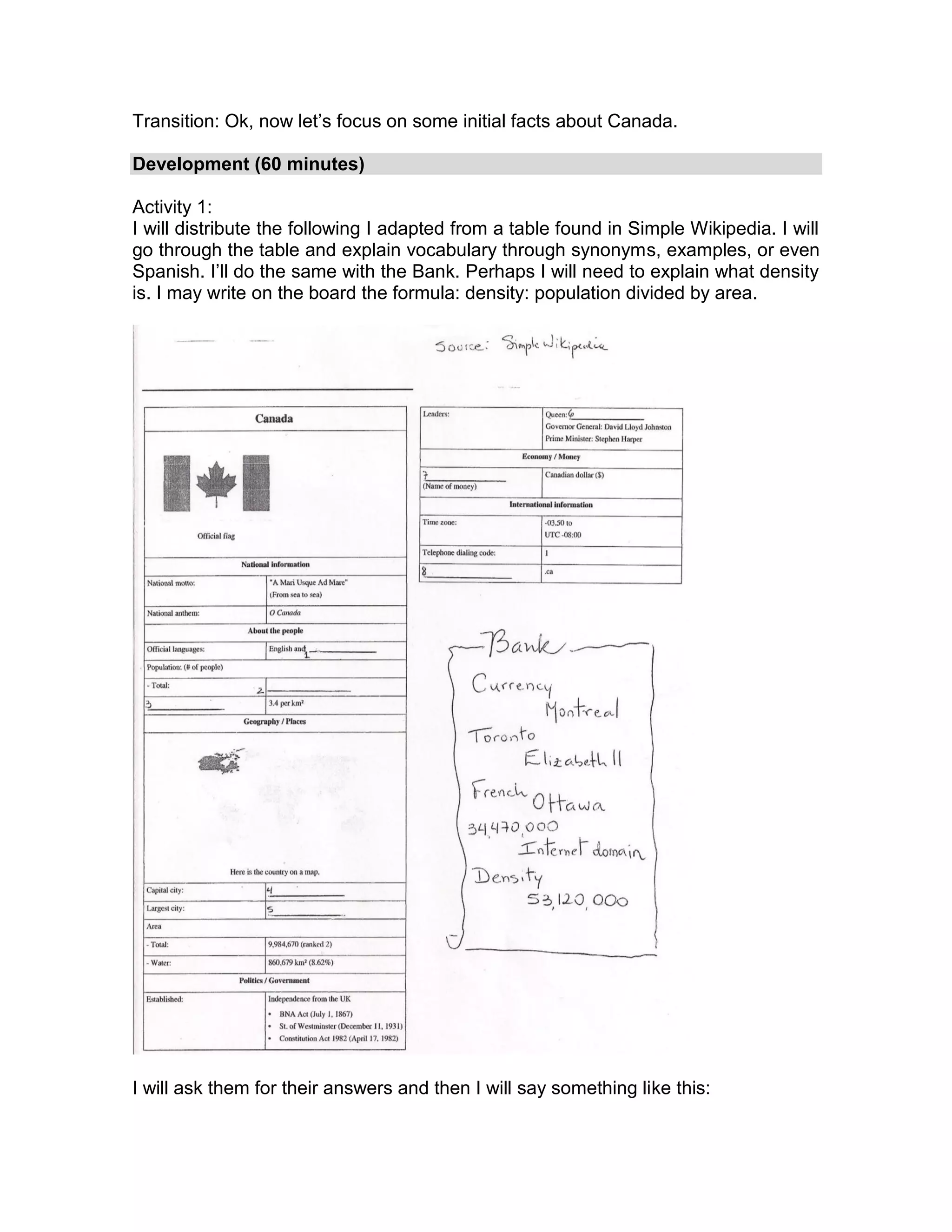 This document provides a lesson plan for teaching 15-16 year old students about countries in the Americas, focusing on Canada. The 80-minute lesson involves 6 activities: 1) introducing facts about Canada through a table, 2) having students complete a paragraph using the facts, 3) learning about common topics in tourism videos, 4) predicting the order topics will be discussed in a Canada video, 5) watching the video to check their predictions, and 6) writing paragraphs summarizing sections of the video script. The lesson aims to develop skills in cohesive country descriptions, paragraph building, and summarization strategies through content about Canada.