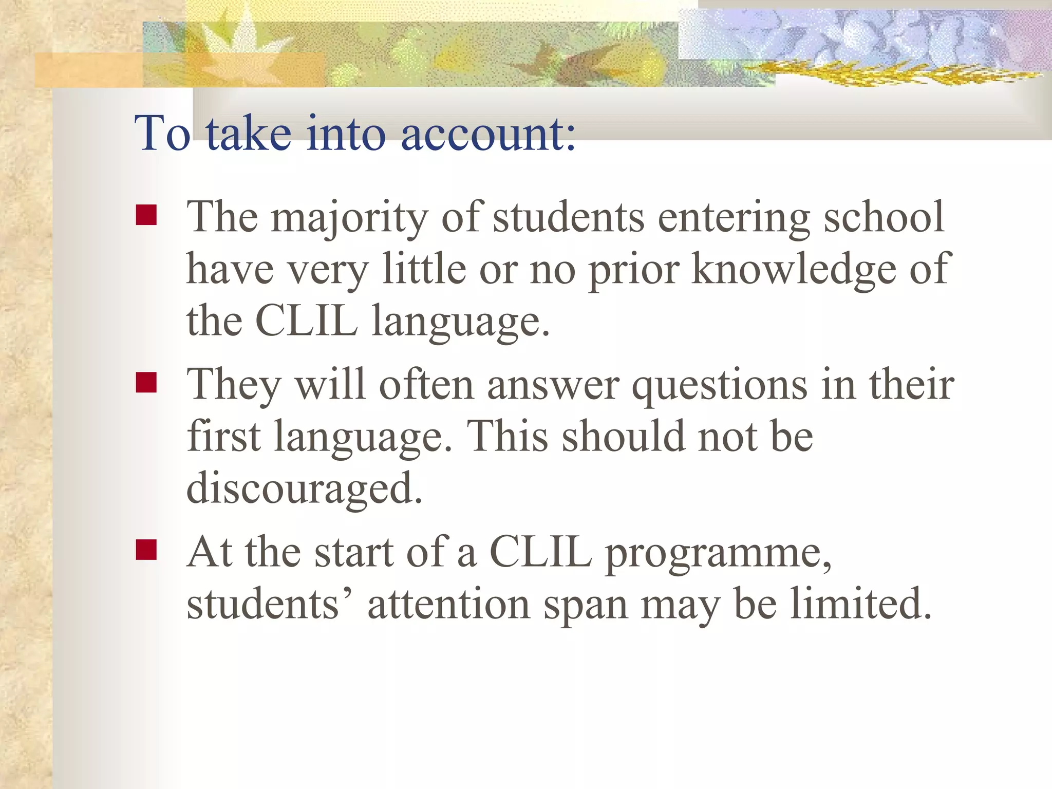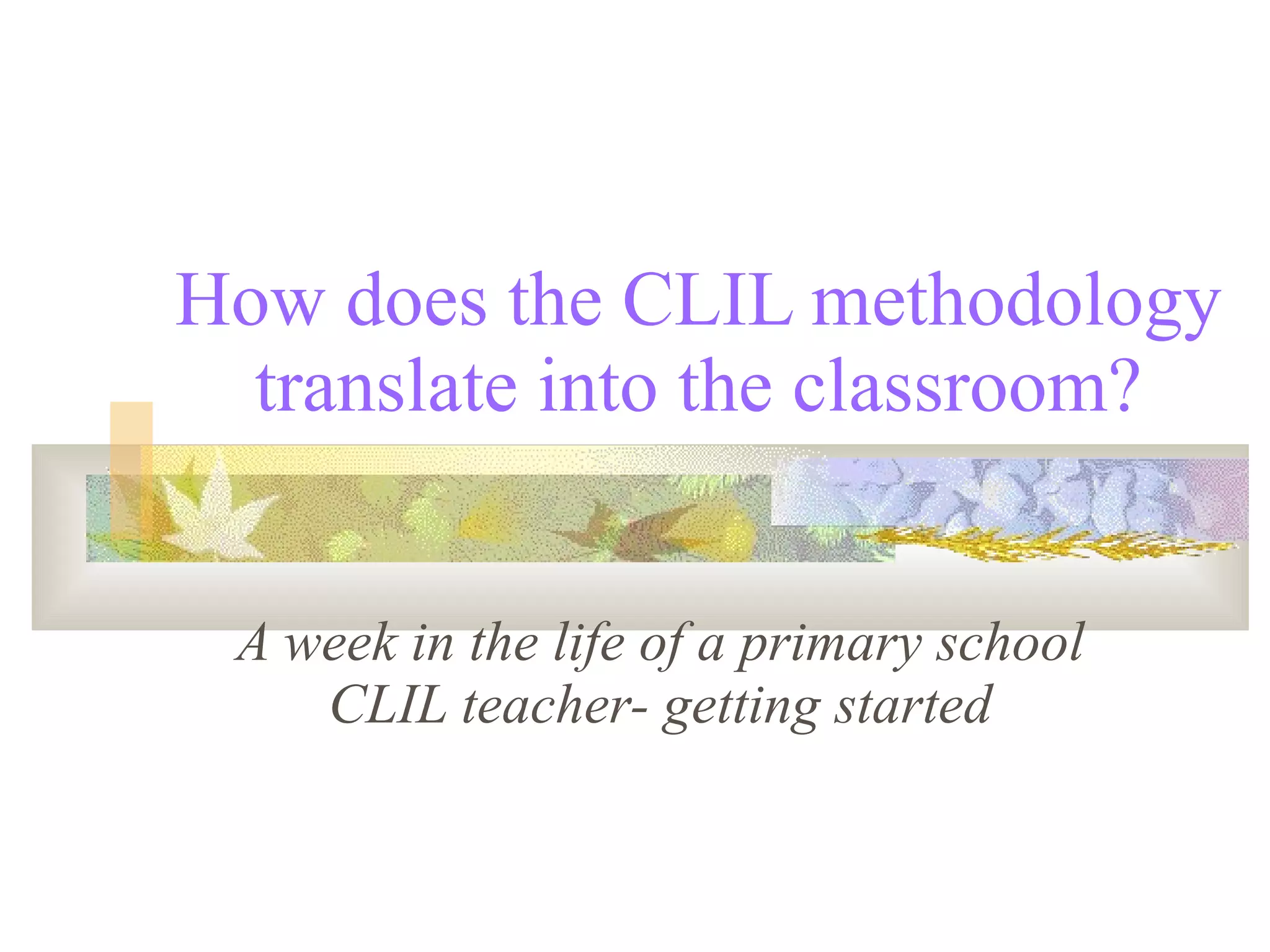 The document describes a typical first week for a primary school teacher implementing CLIL methodology. It outlines the learning outcomes and daily activities for students. Key activities include greeting students in the CLIL language, using a calendar for the date and weather, reading books with pictures, going on a school tour with labeled rooms, doing art and playing outside, integrating math concepts, establishing class rules, teaching colors, and ending each day in a circle reviewing the lessons. The goal is to build students' vocabulary and confidence using the new language through meaningful, content-based activities.