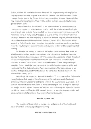 The document summarizes a study that investigated the impact of Content and Language Integrated Learning (CLIL) on the English skills of 40 Thai high school students. The students' listening, reading, speaking, and writing skills were tested before and after three English lessons using CLIL. The results showed significant improvements in all four skills after using CLIL. CLIL helped students learn content and language simultaneously. The study concluded that CLIL is an effective technique for improving English skills in high school students.