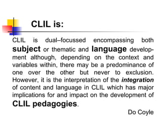 - CLIL (Content and Language Integrated Learning) is a dual-focused approach that integrates both subject/thematic content and language development, with varying emphasis depending on context.