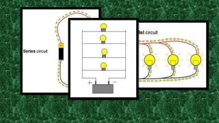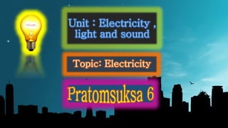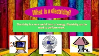 The document discusses electricity and provides instructions to build a simple battery-powered fan. It defines key terms related to electricity like wire, flow, and circuit. It explains that a wire carries electric current and electrons can flow through a wire connecting the two sides of a battery. It also defines components of a series circuit. The instructions show how to construct a fan using paper, wooden sticks, a toy motor, battery, copper wires, foil, and other basic materials. The battery powers the motor which spins the fan propeller.