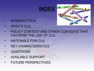 This document provides guidance on Content and Language Integrated Learning (CLIL) in the UK. It discusses how CLIL can be used to integrate language learning with other subjects. Key points include: