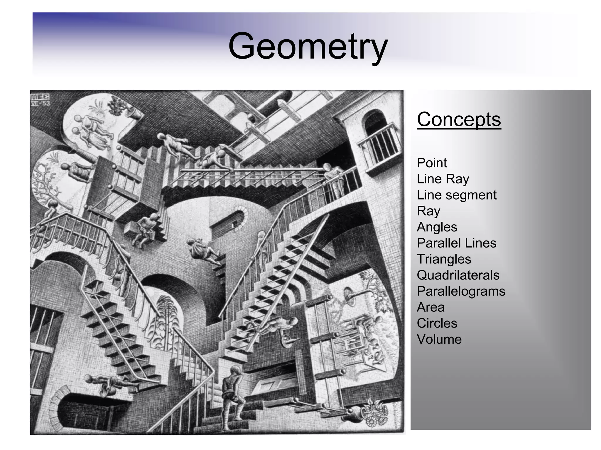 This document defines and describes various geometric shapes and concepts. It defines points, lines, line segments, rays, angles, parallel lines, triangles, quadrilaterals such as parallelograms, rectangles, squares, trapezoids, and rhombi. It also covers circles, areas, volumes, and properties of angles, triangles, parallelograms and polygons. Key concepts include classifying angles as acute, obtuse, right or straight, and properties of parallel lines, perpendicular lines, complementary and supplementary angles.