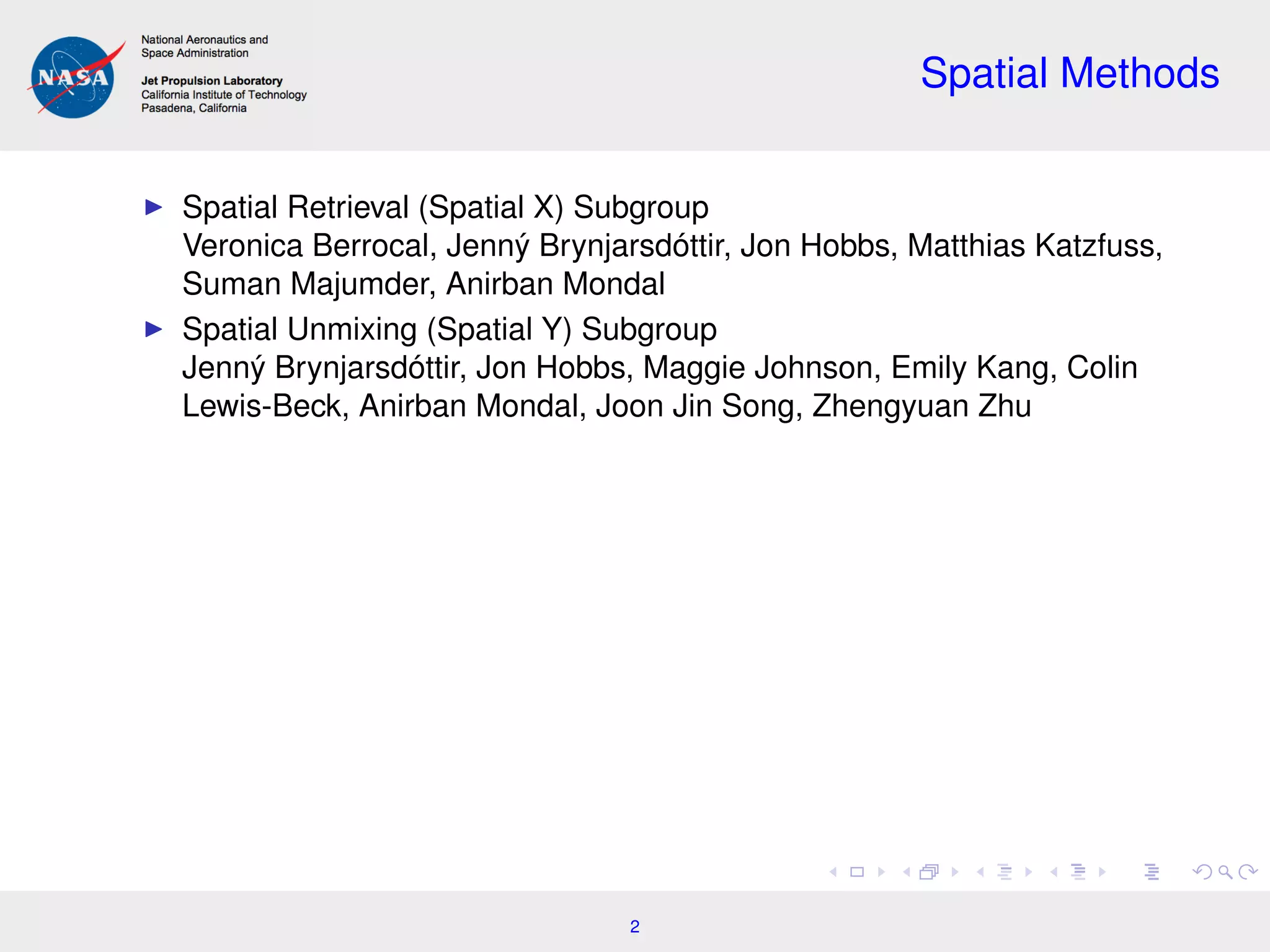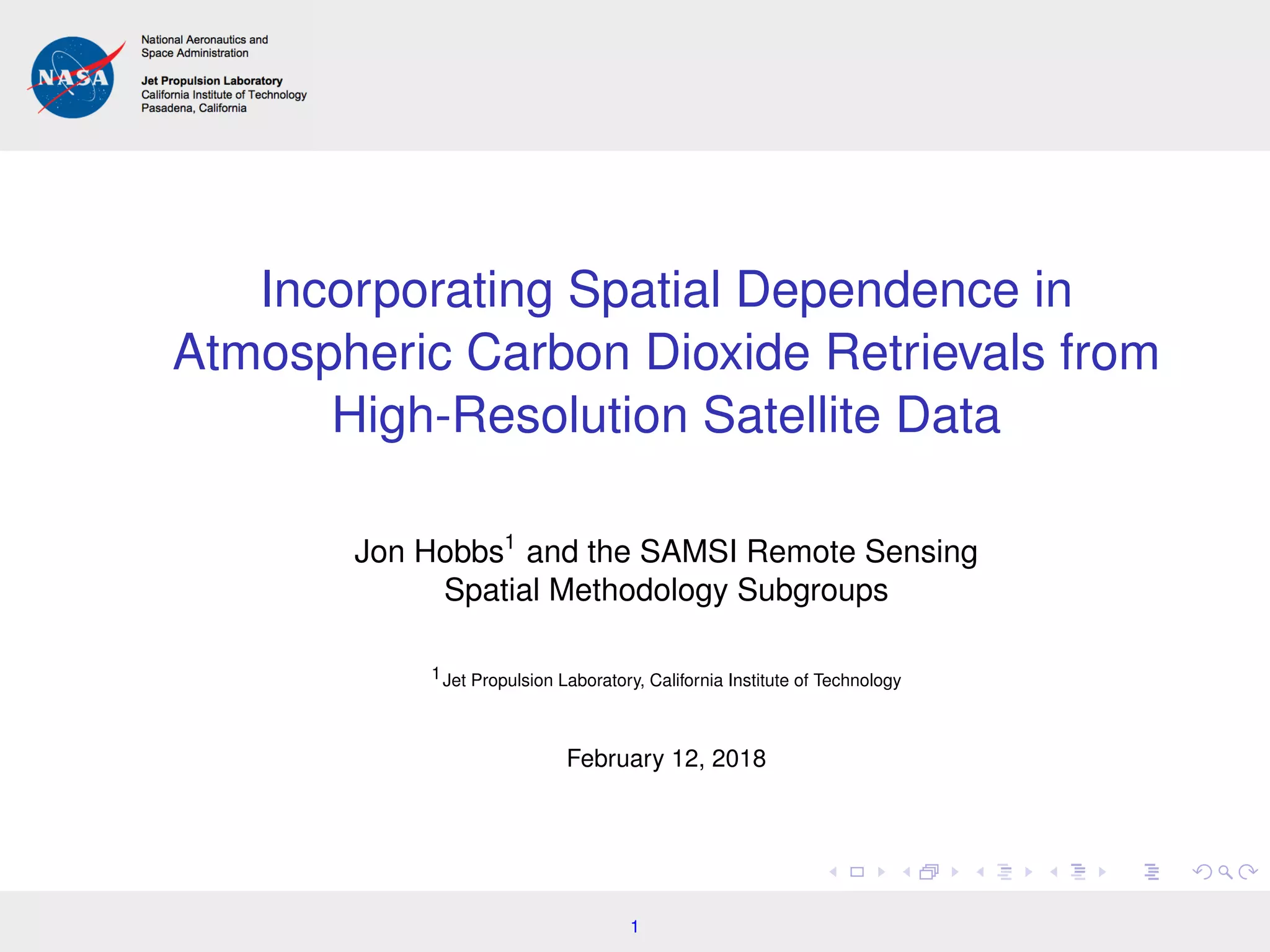This document summarizes work on incorporating spatial dependence into atmospheric carbon dioxide retrievals from satellite data. It discusses using hierarchical Bayesian models to jointly analyze spatially correlated observations across multiple satellite footprints. This allows more precise carbon dioxide concentration estimates by borrowing strength between neighboring observations. Future work may optimize the tradeoff between precision and computational cost when analyzing larger spatial domains. The document also summarizes related work on using spatial unmixing models to estimate heterogeneous land properties like crop moisture levels from satellite imagery.