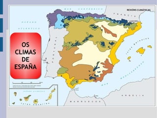 Oceánico costeiro Oceánicode transición Climas de montaña Continentalizado subhúmido Continentalizado de invernos fríos Continentalizado de veráns cálidos Cálido de interior Costeiro Árido e subárido Costeiro cálido Medianías secas temperadas Medianías húmidas Cumios fríos