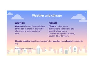 Climate refers to average atmospheric conditions over a long period of time, usually 30-35 years, while weather describes short term conditions. The document then discusses key climate elements - temperature, humidity, precipitation, pressure and winds - and how they are influenced by factors like latitude, altitude, and distance from the sea. Coastal areas generally have milder winters and cooler summers than inland areas. Spain has four main climate types - Mediterranean, Continental, Oceanic and Mountain - which are described based on their characteristic temperatures and precipitation patterns.