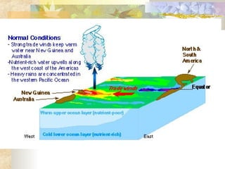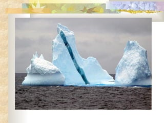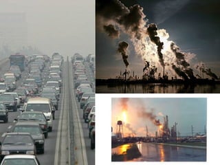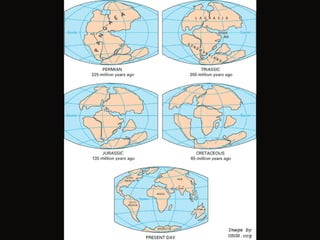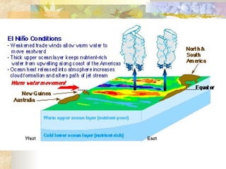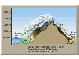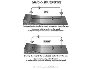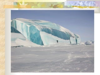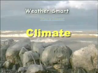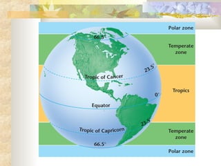 Climate is determined by temperature and precipitation patterns over long periods of time. Several factors influence climate, including latitude, elevation, ocean currents, prevailing winds, and mountain ranges. Climates are generally divided into polar, temperate, and tropical zones based on average temperatures. The climate changes naturally over long timescales due to drifting continents, variations in the sun's output, and periodic changes in the Earth's orientation and orbit known as the Milankovitch cycles, which have corresponded with ice ages in the past. Human activities like burning fossil fuels may also impact climate by increasing greenhouse gas levels and global temperatures.