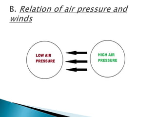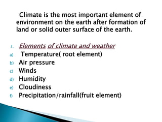 Climate refers to the average weather conditions in an area over a long period of time, usually 30 years or more. It is influenced by temperature, air pressure, winds, humidity, cloudiness, and precipitation. Weather describes the short term state of the atmosphere at a specific time and place. Climate is determined by a chain of elements including temperature, winds, humidity, cloud formation, and different types of precipitation which are influenced by factors like air pressure changes, vertical and horizontal air movement, topography, and proximity to bodies of water and the equator. India's climate is considered a monsoon climate which is marked by a seasonal reversal of wind direction.