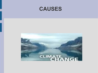 Climate change is caused by factors such as CFCs, carbon dioxide emissions from sources like deforestation and burning fossil fuels for energy and transportation. This is leading to consequences like global warming, damage to the ozone layer, increased greenhouse effect, desertification, and melting of polar ice caps. Some solutions to address climate change include increasing recycling, developing renewable energies, passing ecologically-friendly laws and international agreements, educating the public, and setting goals to reduce emissions.