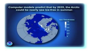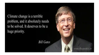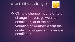 The document discusses climate change, its causes, and the significant impact it has on weather patterns, human life, and natural habitats. It highlights that human activities are the primary cause and presents indicators such as rising temperatures, melting glaciers, and increasing sea levels. Solutions are suggested, including reducing fossil fuel use, upgrading infrastructure, and promoting sustainable living to combat this urgent threat.