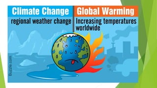 This document discusses climate change and related topics including the greenhouse effect, greenhouse gases, fossil fuels, weather systems, and the impacts of climate change such as extreme weather, flooding, and effects on ice. It explores the science behind climate change and how human activity contributes to changes in global weather patterns.