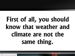 The document explains the difference between weather and climate, emphasizing the role of greenhouse gases in maintaining Earth's temperature and the impact of human activities on climate change leading to global warming. It highlights evidence of climate change, such as glacier melting and shifts in species ranges, while also discussing the increase of carbon dioxide and methane due to industrial activities. The document concludes with practical steps individuals can take to reduce their carbon footprint and combat climate change.