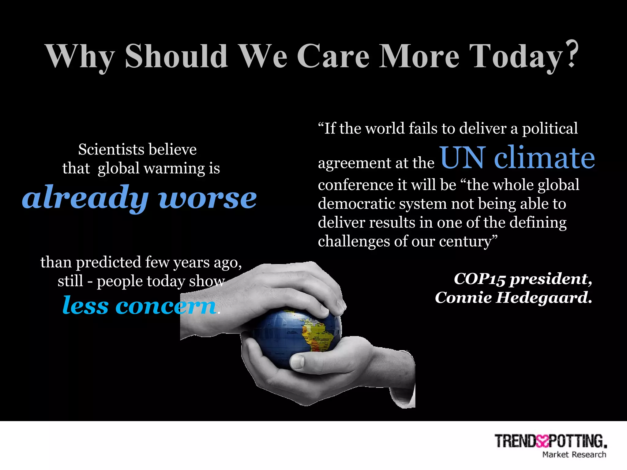 Trendsspotting's 2009 review on global warming highlights a significant decline in public concern despite scientists' warnings that the situation is more severe than predicted. Recent surveys reveal a decrease in Americans acknowledging rising temperatures and seeing global warming as a serious issue, while online metrics indicate a resurgence of interest in climate discussions. The report calls for increased awareness and activism to prompt government action on this critical issue.