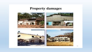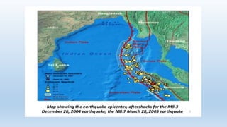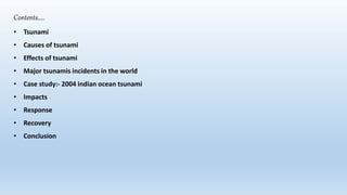The document summarizes a project on the 2004 Indian Ocean tsunami. It defines tsunamis as large ocean waves caused by earthquakes, volcanic eruptions, or landslides. The 2004 tsunami was caused by a 9.1-9.3 magnitude earthquake in the Indian Ocean. It killed over 227,000 people across 14 countries. The impacts included massive loss of life, property damage estimated at $10 billion, and environmental threats. The response involved emergency assistance and long-term recovery efforts like temporary housing, rebuilding infrastructure, and counseling. Governments and communities must take steps to reduce risks and prepare for future tsunamis.
