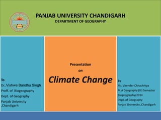 1) The document is a presentation on climate change by Mr. Virender Chhachhiya for the Department of Geography at Panjab University Chandigarh.