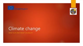 Climate change refers to changes in global or regional climate patterns over long periods of time. It is caused by both natural factors like variations in solar radiation and plate tectonics, as well as certain human activities that release greenhouse gases. Climate change is leading to rising global temperatures, rising sea levels, and more extreme weather events. It threatens plants and animals through changing habitats and environmental conditions exceeding physiological limits.