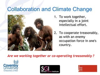 The document discusses the importance of collaboration in addressing climate change, emphasizing that it involves shared goals and can be enhanced through various technologies. It contrasts different collaboration methods, such as asynchronous and synchronous interactions, and notes the potential benefits of virtual collaboration spaces. Additionally, it highlights the complexities of cooperation, including the risks of adversarial collaboration and the disconnect that can arise from global communications.