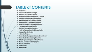The document provides a comprehensive overview of climate change, its causes, impacts, and the essential role of environmental policies in mitigation and adaptation strategies. It discusses various aspects such as greenhouse gas emissions, international agreements, renewable energy policies, and the importance of public awareness and collective action. The urgency for immediate action to combat climate change is emphasized, alongside potential future scenarios based on current and planned efforts.