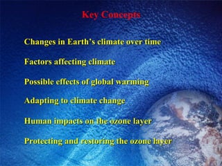 The document summarizes key concepts about climate change and the ozone layer. It discusses how human activities like burning fossil fuels and deforestation have increased greenhouse gas levels and global temperatures over the past century. It also explains how certain chemicals released into the atmosphere deplete the stratospheric ozone layer, increasing health and environmental risks. A variety of international efforts aim to reduce emissions and protect the ozone.