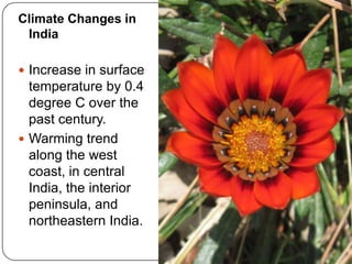 The document discusses the impact of climate change on food security in India, highlighting temperature increases, changes in monsoon patterns, and the vulnerability of rural populations reliant on environmental resources. It outlines the National Action Plan for Climate Change (NAPCC) initiatives aimed at promoting sustainable development, improving water use efficiency, and supporting climate-resilient agricultural practices. Additionally, it emphasizes the need for adaptation strategies to combat the adverse effects of climate variability on agriculture and livelihoods, particularly for the rural poor facing increasing challenges.