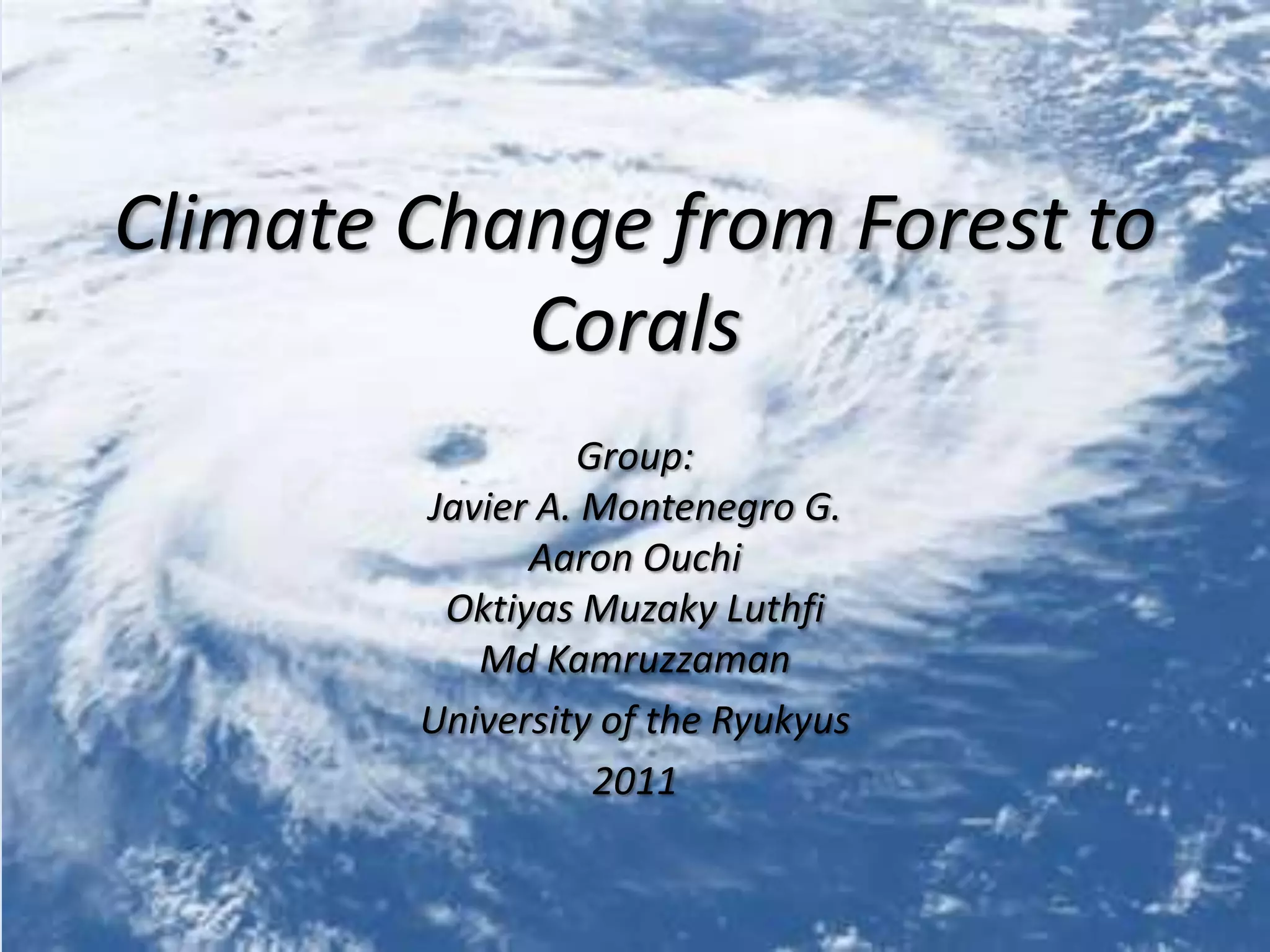 Climate change affects ecosystems through increased greenhouse gases like CO2. Forests normally sequester carbon from the atmosphere through photosynthesis, but deforestation releases stored carbon as CO2. Rising CO2 and temperatures impact coral reefs by increasing ocean acidification and causing coral bleaching. This damages coral's ability to build calcium carbonate skeletons and stresses symbiotic algae. Climate change therefore has wide-ranging ecological, economic, and social consequences for forests, coastlines, and communities that depend on healthy coral reefs.