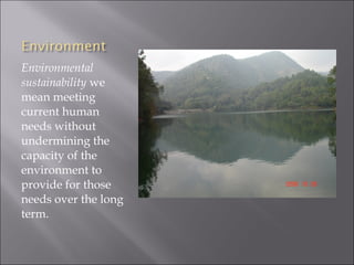 The document discusses environmental sustainability and the challenges posed by environmental degradation. It notes that [1] environmental problems exist due to both human and natural factors, and poor, rural populations are often most affected. It then outlines several drivers of environmental degradation, including [2] population growth, consumption patterns, economic factors, and climate change. Finally, it recommends [3] reforms like mainstreaming environmental costs, regulating subsidies, improving governance, and investing in sustainable agriculture and education to promote environmental sustainability.