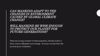 The document discusses the complex challenges posed by climate change, emphasizing the disparity between developed and developing nations and the moral responsibilities that arise from this divide. It highlights the urgent need for global cooperation and diverse solutions tailored to different regional needs, as well as the importance of individual actions and education in combating climate change. The text warns of potential catastrophic outcomes if humanity fails to adapt and act decisively against the ongoing environmental crisis.