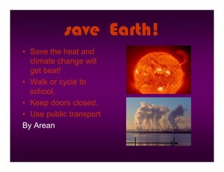 This document contains messages from multiple students urging others to take actions to help save the planet from climate change. Many of the suggested actions are reducing energy and fossil fuel usage through walking or cycling instead of driving, recycling, using public transportation, installing energy-efficient appliances, and keeping doors and windows closed to reduce heating/cooling costs. The students emphasize that small individual actions, when taken by many people, can make a significant impact on reducing pollution and slowing global warming.
