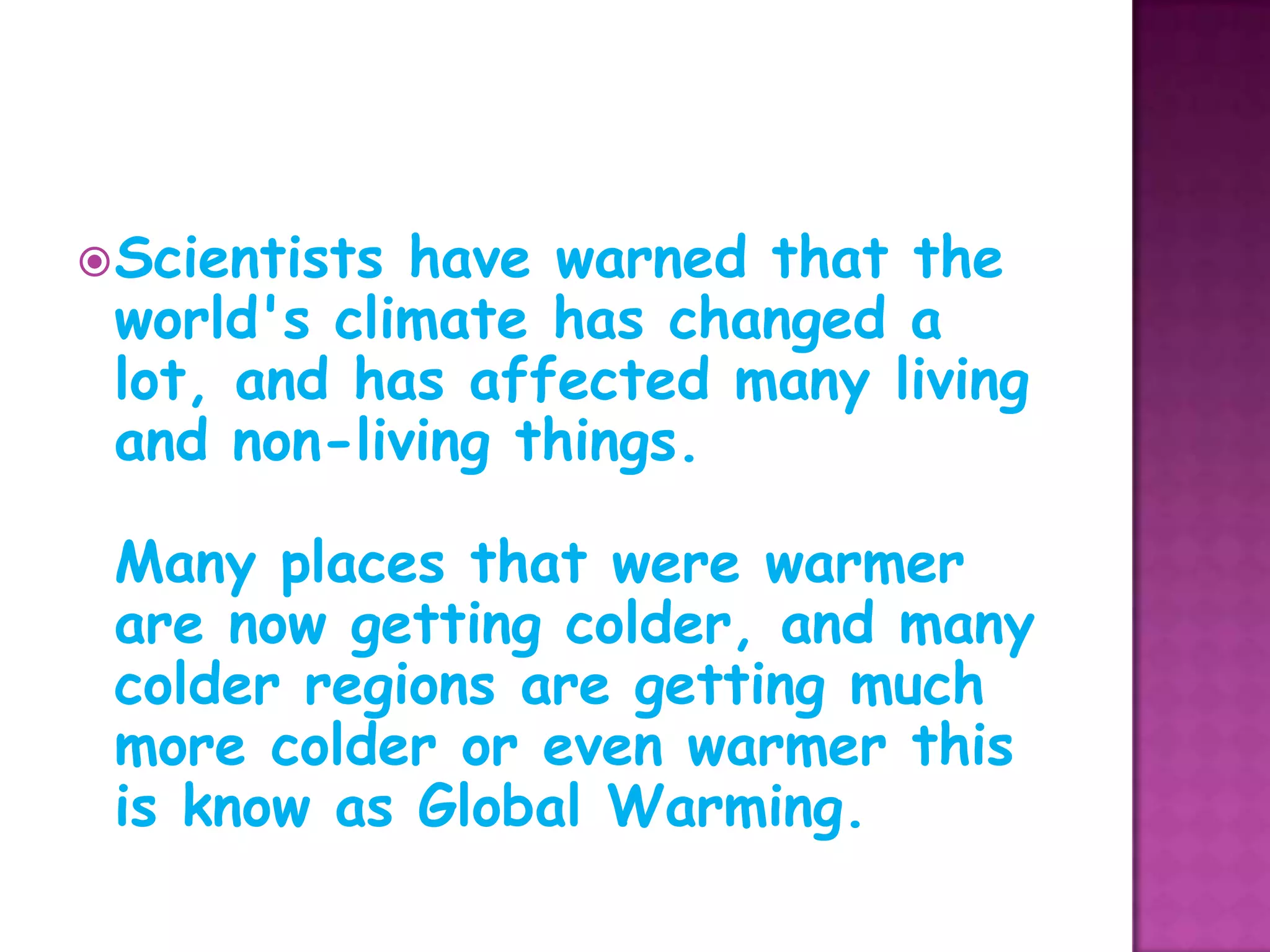 Scientists have warned that the world's climate is changing rapidly due to human-caused greenhouse gas emissions, primarily from burning fossil fuels. The warming climate is causing glaciers to melt and stronger storms to form. While climate has changed naturally in the past, current changes are occurring faster and are driven by human activity. The climate refers to long-term weather patterns over years in a given location, while weather describes short-term outdoor conditions. Greenhouse gases in the atmosphere, such as carbon dioxide, trap heat and maintain the Earth's warm temperature.