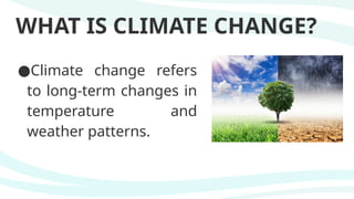 Climate change is a long-term alteration in temperature and weather, accelerated by human activities since the 1800s, primarily through fossil fuel combustion and deforestation. Its impacts include stronger storms, rising sea levels, and effects on daily life such as increased food prices and coastal flooding. Mitigation strategies include saving electricity, planting trees, recycling, and educating others to collectively combat climate change.