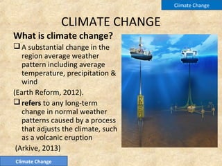 This document presents information on climate change, including its causes, effects, and methods of prevention. It discusses how burning fossil fuels and increased population have contributed to higher greenhouse gas emissions. Some effects of climate change mentioned are flooding, droughts, health impacts, species extinction, and risks to human existence. The document recommends ways to prevent further climate change such as using less energy, adopting cleaner transportation and energy sources, and engaging in recycling and waste reduction efforts.