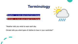 The document discusses the differences between climate and weather, emphasizing their respective short-term and long-term impacts. It provides vocabulary and phrases related to climate change and environmental issues, including strategies for individuals and governments to address these challenges. Additionally, it includes questions and prompts for discussing personal experiences with weather and environmental awareness.