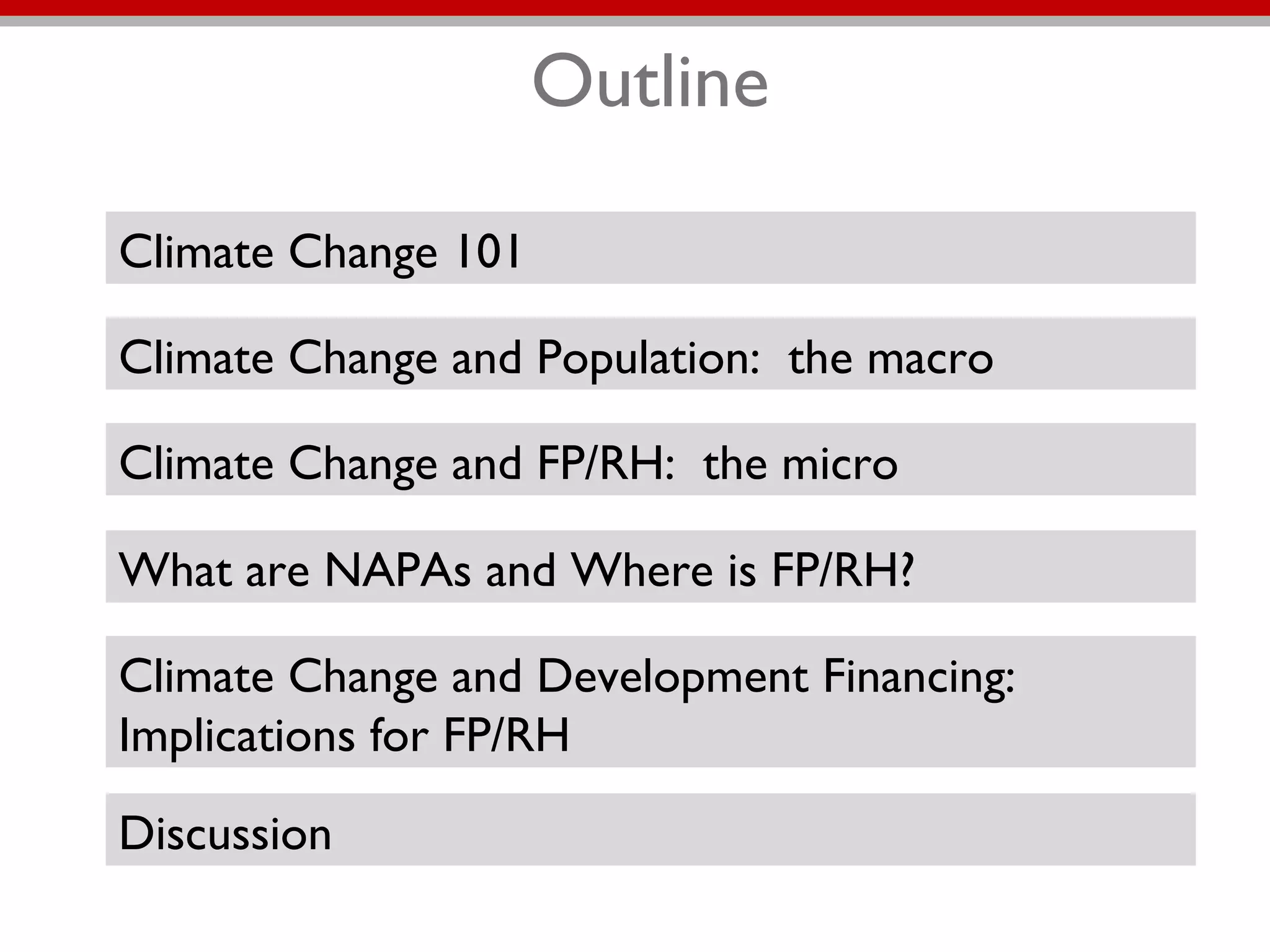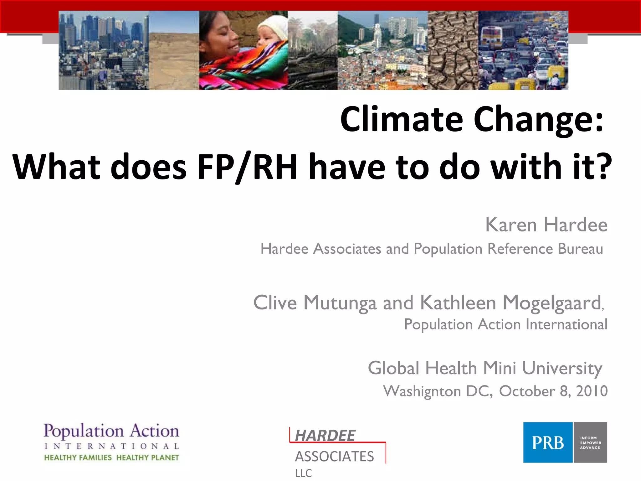 Climate change is unequivocal and largely due to human activities like greenhouse gas emissions. Effects include increased temperatures, sea level rise, and more extreme weather. Family planning can help adaptation by slowing population growth and reducing stress on resources. Many National Adaptation Programs of Action recognize population growth as exacerbating climate impacts but few include family planning in projects. Integrating family planning into community-based adaptation could help address unmet need and strengthen resilience.