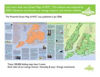 The document discusses the 'Powerful Green Map of NYC', which was created to raise awareness about energy choices and climate impacts. It highlights various tools and resources, including interactive maps and educational modules for students and teachers, that aim to promote community resilience and renewable energy. The initiative involved partnerships, cycling tours, and localized mapping efforts across 40 countries, focusing on both local and global environmental issues.
