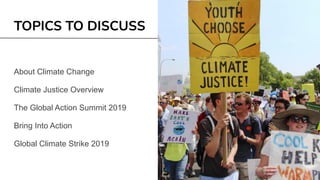 The document discusses climate justice and the urgent need for action against climate change, highlighting the three primary causes: burning fossil fuels, deforestation, and livestock farming. It defines climate justice as a civil rights movement focused on vulnerable communities and outlines key proposals from the UN Climate Action Summit 2019, including a transition to renewable energy and sustainable agriculture. The global climate strike on September 23, 2019, saw over 7.6 million participants, emphasizing the necessity for immediate change.