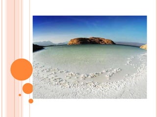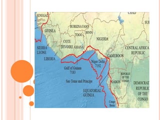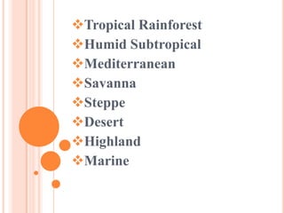 This document discusses the climate and topography of Africa. It notes that over 50% of Africa has inadequate precipitation and 92% experiences climatic contrasts with shortage of water in some areas and oversupply in others. About 8% has a tropical climate with rainfall 10-12 months per year. Africa has about one-third of the world's arid lands and temperature variations are not excessive, though lower plains and desert regions experience great heat. The most important climatic differences are due to rainfall variations.