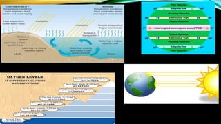 This document discusses factors that influence India's climate such as latitude, altitude, pressure and wind systems, ocean currents, distance from the sea, and relief features. It explains key climate concepts like weather, climate, the Coriolis force, jet streams, and the intertropical convergence zone. The climate of India is affected by its location in the northern hemisphere, the Himalayan mountain range, seasonal reversal of wind patterns, and monsoon winds that originate from the southern Indian Ocean.