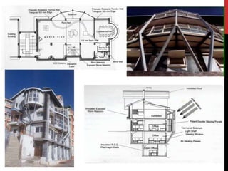 1) The building was designed by architect Arvind Krishan to be energy efficient using passive solar techniques suitable for Shimla's cold climate, including air heating panels, insulation, and a connective loop staircase to distribute heat.