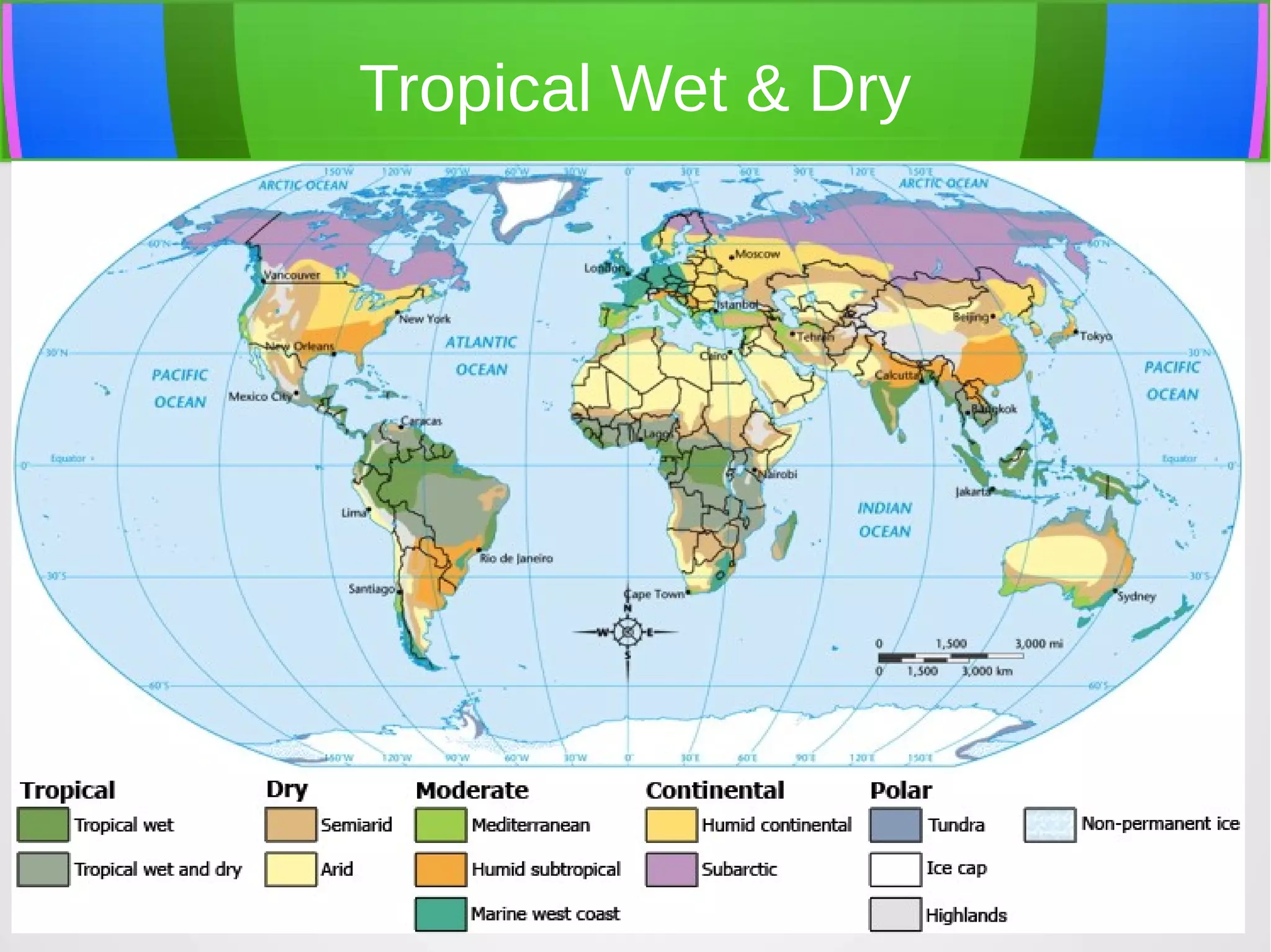 The document summarizes several different climate zones including Tropical Wet & Dry, Arid, Highlands, Humid Continental, Tropical Wet, Mediterranean, Semi Arid, and Humid Subtropical. It provides information on the location, temperature, precipitation, vegetation, and influences on climate for each zone.