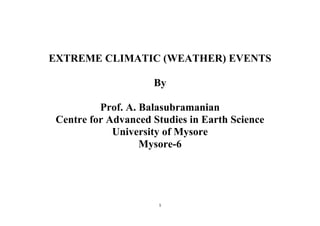 The document discusses extreme climatic events, defining climate as long-term weather patterns and highlighting the impact of global climate change on the frequency and intensity of these events. It categorizes various extreme weather phenomena, such as cyclones, hurricanes, tornadoes, and thunderstorms, detailing their characteristics, causes, and consequences for human and natural systems. It also emphasizes the role of temperature and moisture in the formation of these severe weather events and their potential to cause significant damage and loss of life.