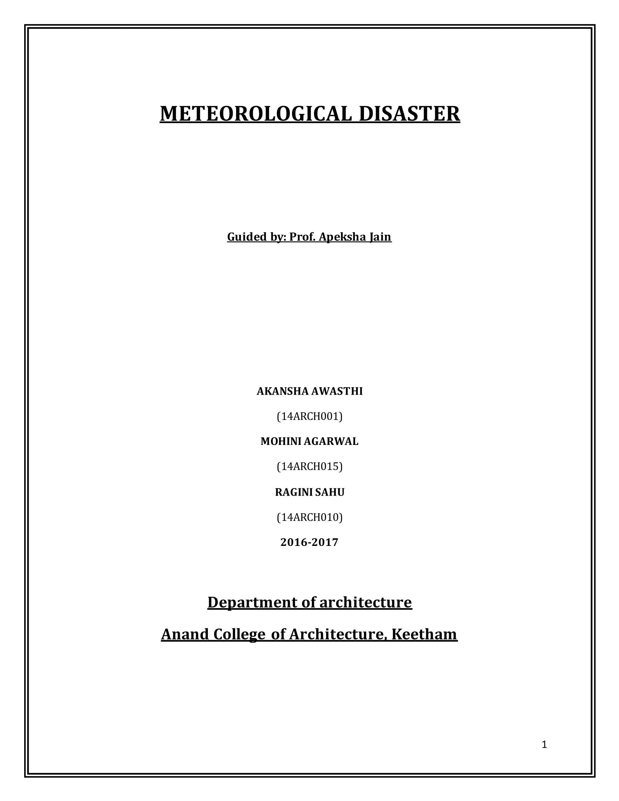 This document provides an overview of meteorological disasters including cyclones, tornadoes, hail storms, hurricanes, and blizzards. It begins with defining meteorological disasters and listing their main types. Subsequent chapters discuss the formation, characteristics, major events, and mitigation methods for each disaster type. For cyclones, specifics covered include typical structure and movement, classification systems used in India, and details on major cyclones like Hudhud. The document aims to inform about these destructive weather phenomena and how their impacts can be reduced.