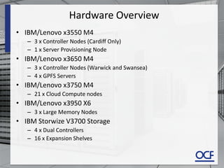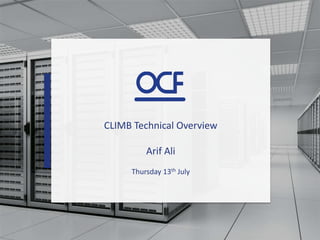 The document provides a technical overview of the CLIMB OpenStack cloud including hardware, software, and configuration details. The key components are IBM servers and storage, xCAT for provisioning, SaltStack for configuration management, OpenStack for cloud services, and IBM Spectrum Scale (formerly GPFS) for parallel file storage. Spectrum Scale is integrated with OpenStack components like Cinder, Glance, and Swift to provide scalable block and object storage.