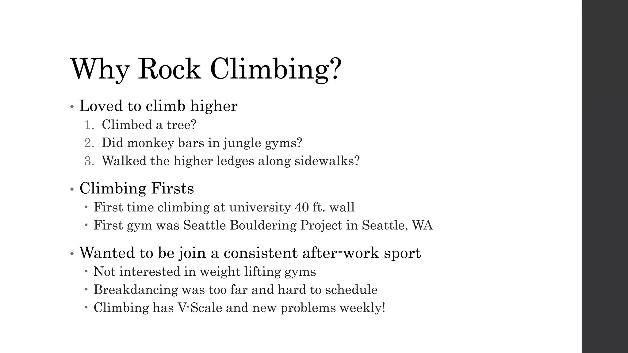 Michael Dang outlines his journey in rock climbing from casual to competitive, starting with his first experiences and progress through various grades. He details his training regimen, milestones achieved over the years, and the transition into competitive climbing. Currently, he is preparing for a national competition while aiming to reach new climbing grades and expresses appreciation for the sport's accessibility.
