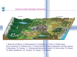 Esquema dels paisatgestemperats 1. Bosc de coníferes. 2. Embassament. 3. Carretera. 4. Túnel. 5. Poble al peu de la muntanya. 6. Indústria rural. 7. Camps oberts. 8. Bosc esclarissat i de fulla caduca. 9. Serradora. 10. Camps. 11. Indústria als afores de la ciutat. 12. Gran ciutat. 13. Erosió. 14. Bosc mediterrani. 15. Turisme. 16. Vinyes. 17. Oliveres. Zona freda zona mediterrània