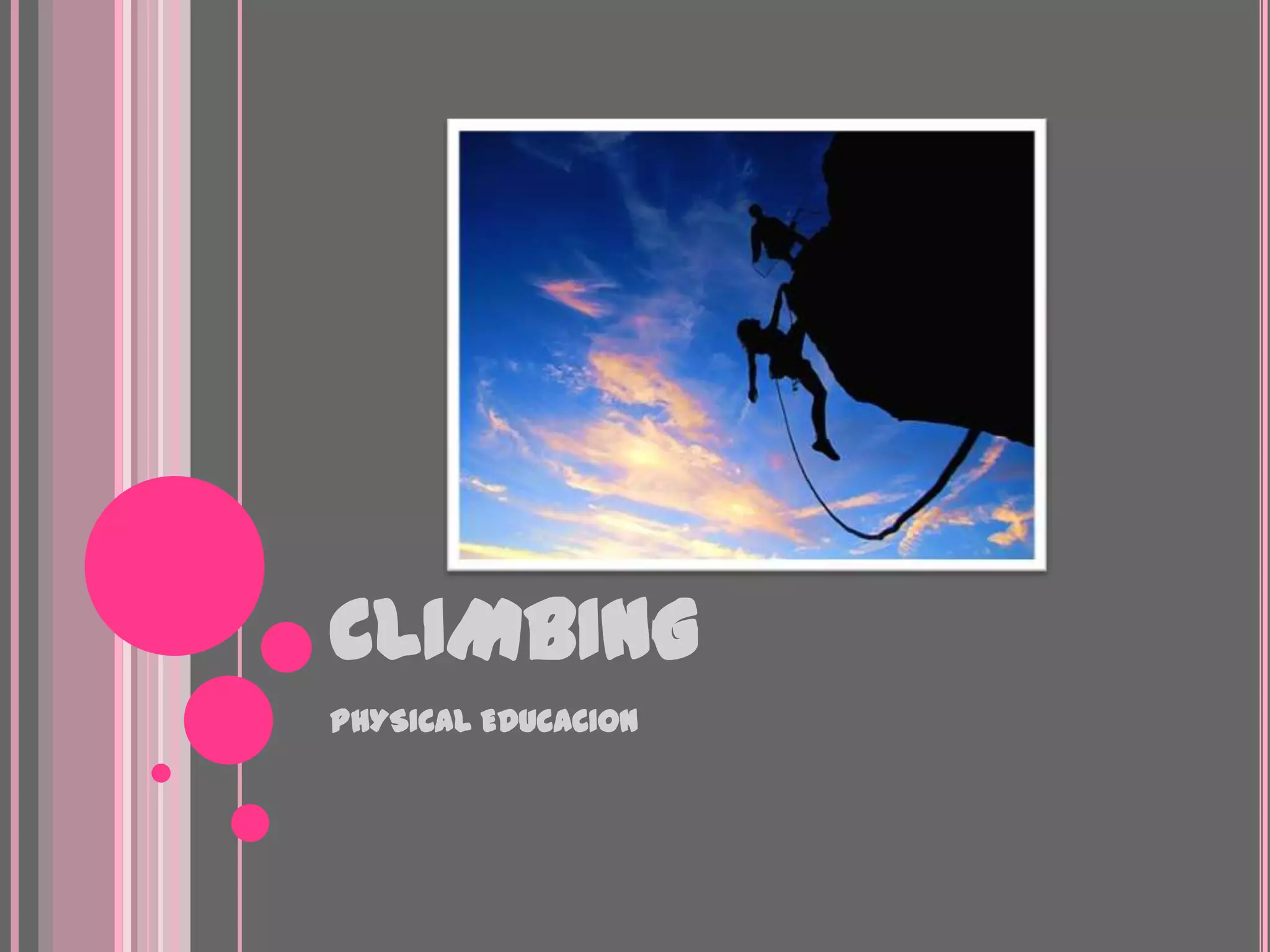 This document provides information about climbing as a physical activity, including different styles of climbing, equipment used, and roles in climbing competitions. It discusses rock climbing, ice climbing, artificial climbing structures, and different techniques such as free climbing, alpine climbing, bouldering and psicobloc. Safety equipment for rock climbing is described, including ropes, helmets, carabiners, chalk bags, harnesses, climbing shoes, quickdraws and other gear. Hand and foot holds, as well as climbing techniques, are also outlined. Finally, the document discusses the roles of different people involved in climbing competitions such as route judges, belayers and timekeepers.